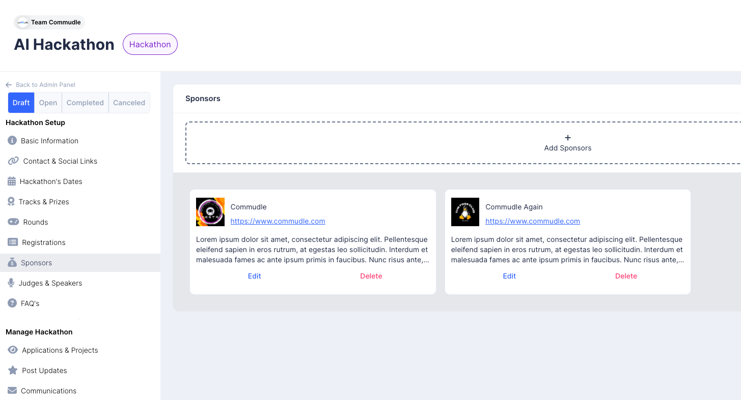 Add sponsors for various sponsorship tiers and help them gain visibility through your hackathon