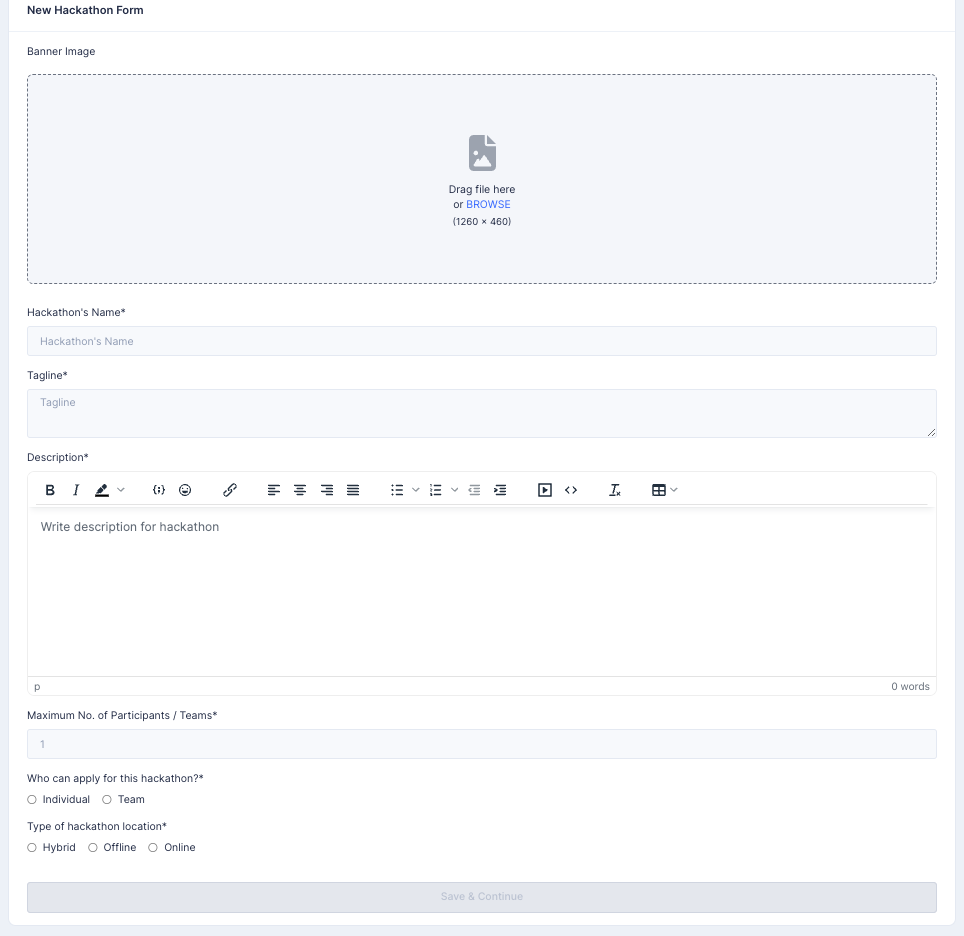 3. Fill the basic hackathon information form fields and click **Save & Continue**