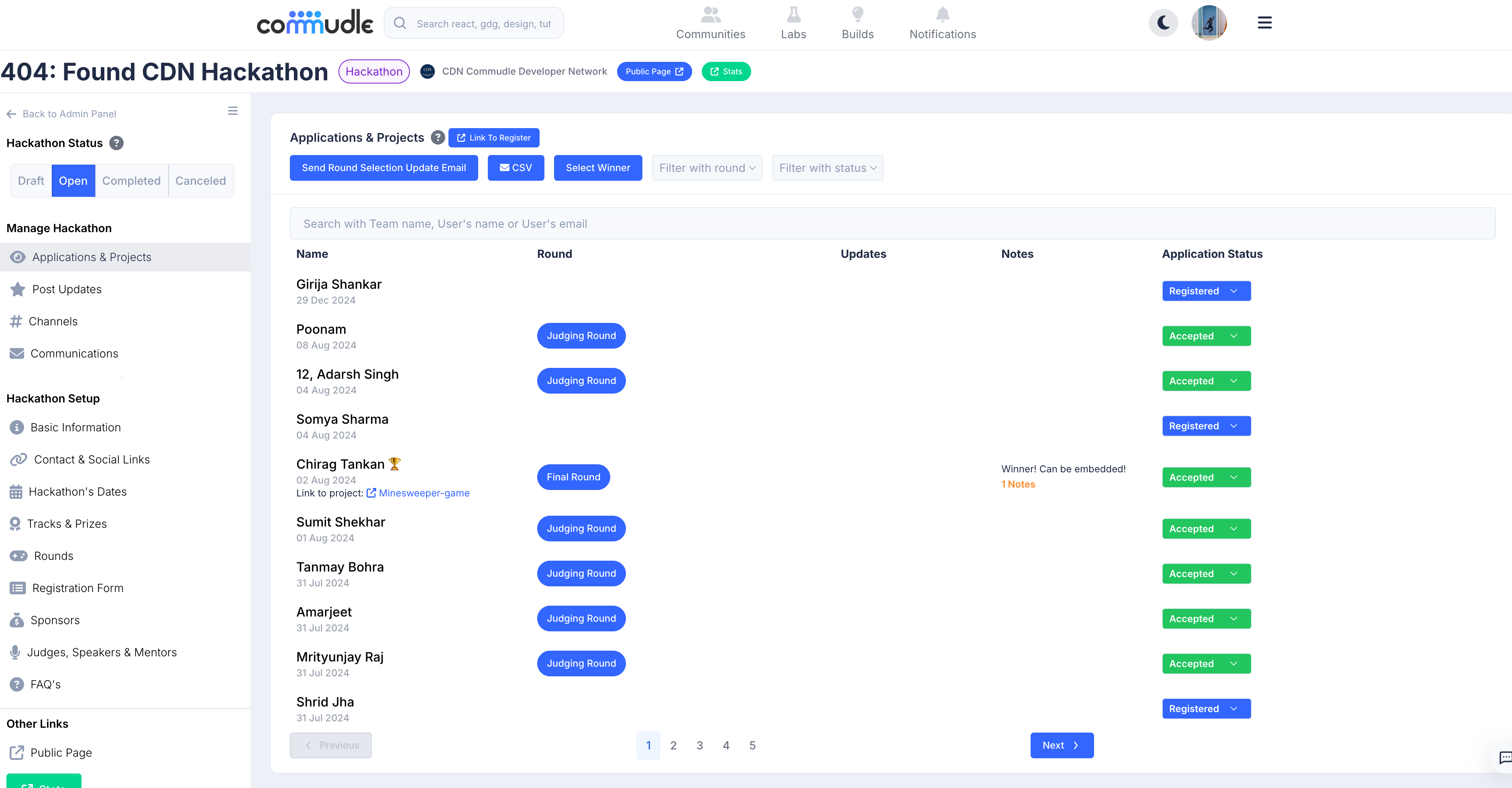 Commudle now supports advanced filtering for projects and teams in the Hackathon dashboard. This feature allows admins and organizers to quickly locate specific applications or participants based on various criteria, improving efficiency and management during hackathons.